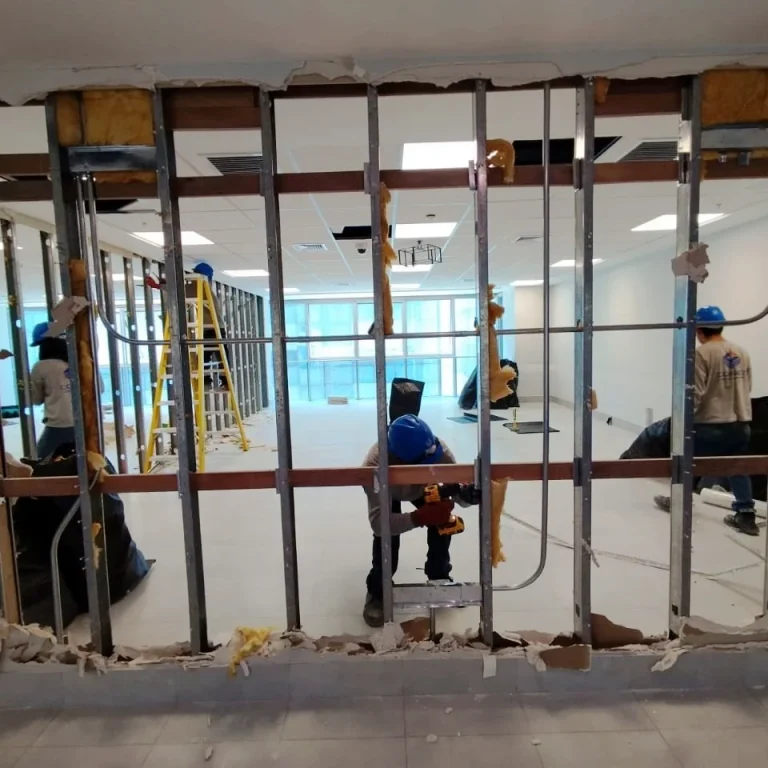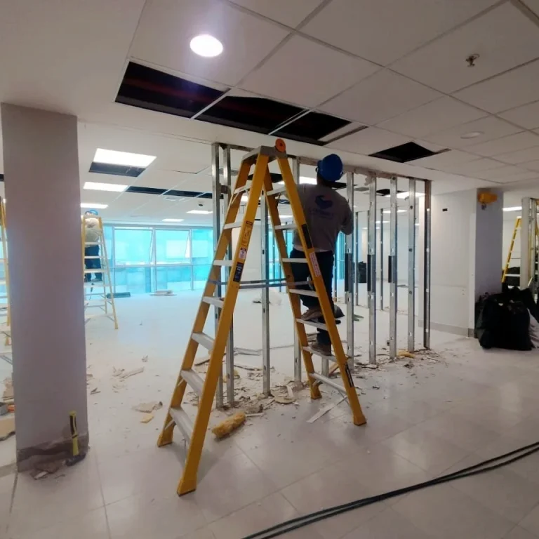 - Obras civiles y arquitectura (desmontajes, demolición, tabiquería de drywall, suministro de falso cielo raso, pintura, enchapes, puertas y mamparas de vidrio, muebles).